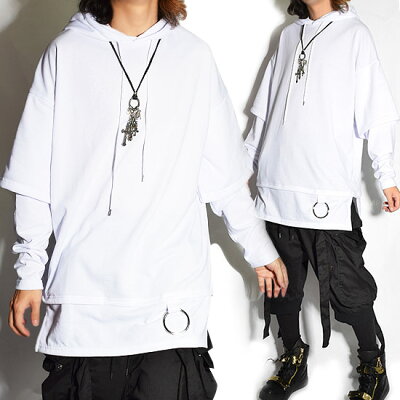 パーカー メンズ ロングTシャツ プルーバーパーカー ロング丈 カットソー 変形 ロンt フードカットソー リング 重ね着 無地 ホワイト 白 フード お兄系 V系 ビジュアル系 ホスト 大人 2017 秋 冬 新作 30代 40代 個性的 モード系ファッション ストリート系ファッション 衣装