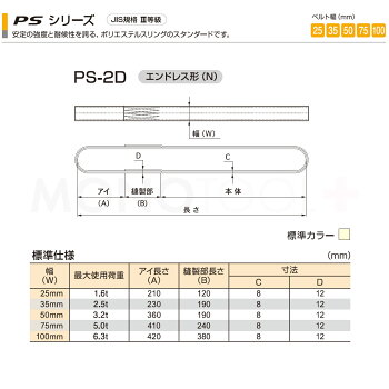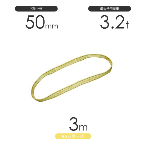仕様 ベルトタイプ:PSシリーズ ポリエステルスリング 形状:エンドレス形(N型) アイ寸法:360mm ロープ:幅50mm×長さ:3m 最大使用荷重:3.2t 規格:JIS規格3等級 日本製 使用温度:100℃以下 ※商品の使用荷重・寸法詳細などは画像を参考にして下さい。