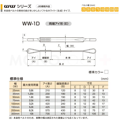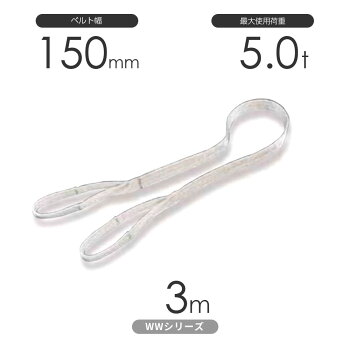 仕様 ベルトタイプ:WWシリーズ(未染色)ナイロンスリング 形状:両端アイ形(E型) アイ寸法:425mm ロープ:幅150mm×長さ:3m 最大使用荷重:5.0t 規格:JIS規格3等級 日本製 使用温度:100℃以下 ※商品の使用荷重・寸法詳細などは画像を参考にして下さい。