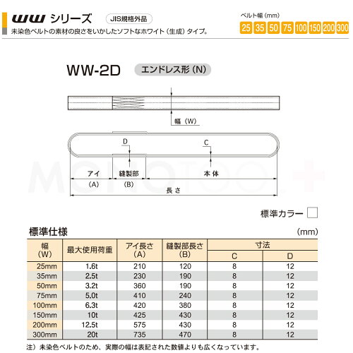 仕様 ベルトタイプ:WWシリーズ(未染色)ナイロンスリング 形状:エンドレス形(N型) アイ寸法:425mm ロープ:幅150mm×長さ:3m 最大使用荷重:10t 規格:JIS規格3等級 日本製 使用温度:100℃以下 ※商品の使用荷重・寸法詳細などは画像を参考にして下さい。