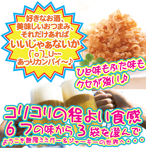 オキハム ジャーキー大 3袋セット 9種からお好み3袋を選べる ミミガージャーキー 激辛ミミガージャーキー スッパイマンミミガージャーキー 沖縄しま豚ジャーキー 沖縄しま豚ジャーキー黒胡椒 Orionしま豚ジャーキー 3袋よりどりセット ビールのおつまみ 下記6種から7種選べます ■ミミガージャーキー 23g ■激辛ミミガージャーキー 23g ■スッパイマンミミガージャーキー 25g ■沖縄しま豚ジャーキー 25g ■沖縄しま豚ジャーキー黒胡椒 25g ■Orionしま豚ジャーキー 25g 150日 直射日光・高温多湿を避け、常温保存 ミミガージャーキー 豚耳皮肉、しょうゆ、梅酢、梅エキス、食酢、砂糖、たん白加水分解物、赤唐辛子、生姜パウダー、酵母エキス、調味エキス(たん白加水分解物、デキストリン、酵母エキス、砂糖)、グリセリン、pH調整剤、甘味料(アスパルテーム・L-フェニルアラニン化合物、ステビア、甘草、スクラロース)、保存料(ポリリジン)、香料、(原材料の一部に小麦、大豆を含む) ■栄養成分表示(1袋23gあたり):エネルギー82kcal、たんぱく質10.5g、脂質2.9g、炭水化物3.4g、食塩相当量1.8g 激辛ミミガージャーキー 豚耳皮肉(国産)、しょうゆ、砂糖、調味酢、食酢、調味エキス、赤唐辛子(沖縄県産)、パプリカパウダー、たん白加水分解質、酵母エキス/グリセリン、グリシン、pH調整剤、酸味料、保存料(ポリリジン)、香料、(一部に小麦・豚肉・大豆を含む) ■栄養成分表示(1袋23gあたり)推定値:エネルギー87kcal、たんぱく質10.8g、脂質3.5g、炭水化物3.0g、食塩相当量1.6g スッパイマンミミガージャーキー 豚耳皮肉、しょうゆ、梅酢、梅エキス、食酢、砂糖、たん白加水分解物、赤唐辛子、生姜パウダー、酵母エキス、調味エキス(たん白加水分解物、デキストリン、酵母エキス、砂糖)、グリセリン、pH調整剤、甘味料(アスパルテーム・L-フェニルアラニン化合物、ステビア、甘草、スクラロース)、保存料(ポリリジン)、香料、(原材料の一部に小麦、大豆を含む) ■栄養成分表示(1袋25gあたり):エネルギー95kcal、たんぱく質11.9g、脂質3.8g、炭水化物3.3g、食塩相当量1.7g 推定値 沖縄しま豚ジャーキー 豚肉(沖縄県産)、醤油、砂糖、みりん風調味料、乳たん白、みそ、食塩、還元水あめ、大豆たん白、ジンジャーパウダー、赤唐辛子、チキンコンソメ、リン酸塩(Na)、調味料(アミノ酸等)、保存料(ソルビン酸K)、pH調整剤、酸化防止剤(ビタミンC)、着色料(カラメル、カルミン酸)、発色剤(亜硝酸Na)、(原材料の一部に小麦、乳成分、豚肉、牛肉、鶏肉、大豆を含む) ■栄養成分表示(1袋25gあたり):エネルギー82kcal、たんぱく質11.6g、脂質1.8g、炭水化物4.9g、ナトリウム501mg 沖縄しま豚ジャーキー黒胡椒 豚肉、食塩、水飴、香辛料、調味料(アミノ酸等)、酸味料、香料、発色剤(亜硝酸Na) ■栄養成分(1袋25gあたり):エネルギー84kcal、たんぱく質14.5g、脂質2.4g、炭水化物1.3g、ナトリウム503mg(食塩相当量1.3g) Orionしま豚ジャーキー 豚肉(沖縄県産)、還元水あめ、食塩、香辛料(黒こしょう、キャラウェイ)、ビール酵母、調味料(アミノ酸等)、酸味料、香料、発色剤(亜硝酸Na) ■栄養成分表示(1袋25gあたり):エネルギー86kcal、たんぱく質15.2g、脂質2.6g、炭水化物0.5g、ナトリウム355mg(食塩相当量0.9g) ◆全国送料無料/ネコポス便にて配送 ご注文をお受けして3営業日以内の発送を心がけています。